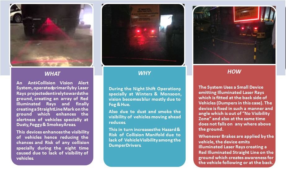 A Night Vision Laser Alert Device has been initiated by NKCPL JSR in its RMM Operational Site of Tata Steel Ltd for the Dumpers to enhance the Alertness of the drivers especially during operations during the night, fogy and smoky areas and times.